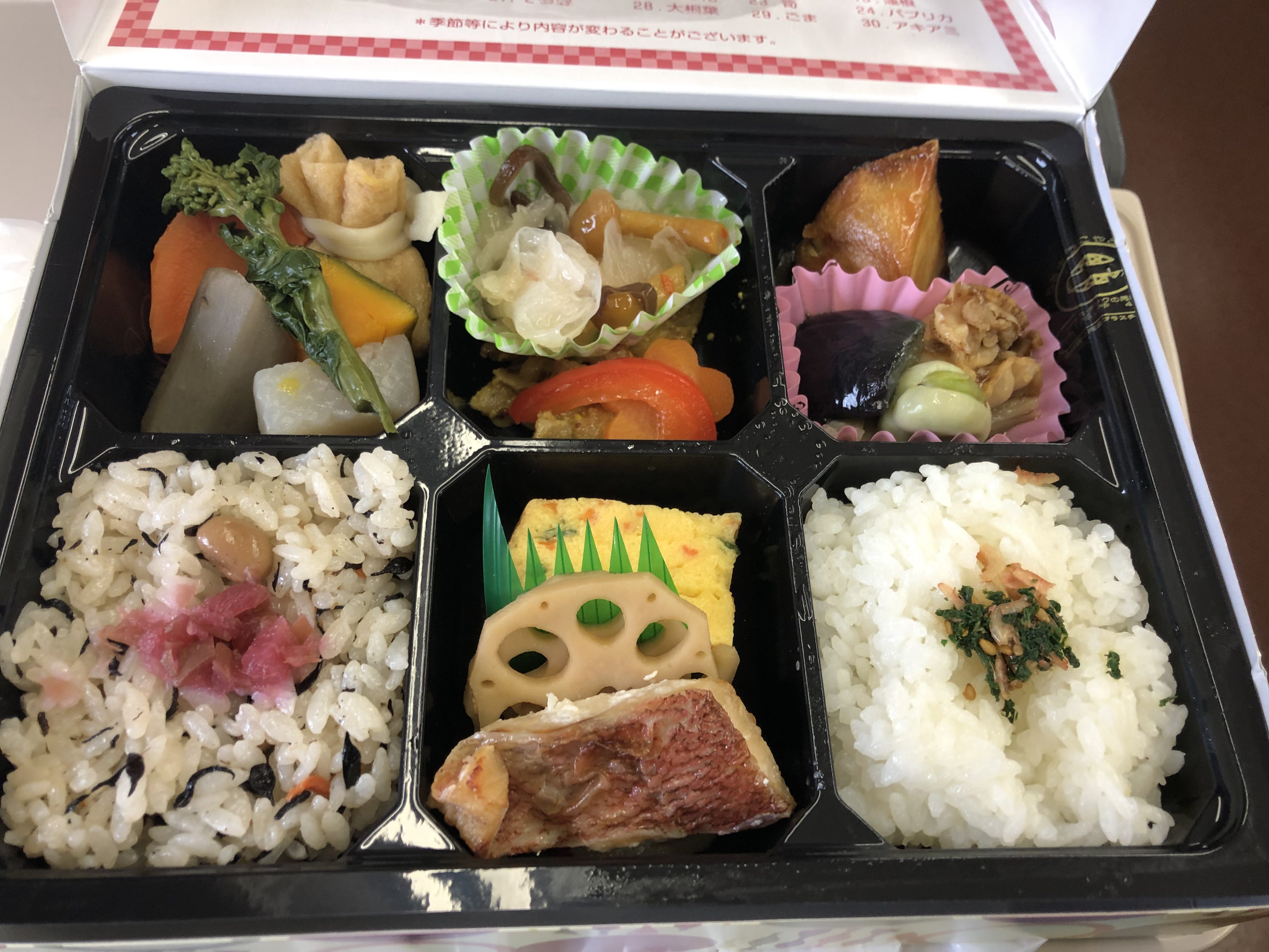 Nous nous achetons des bentos pour déjeuner dans le train.