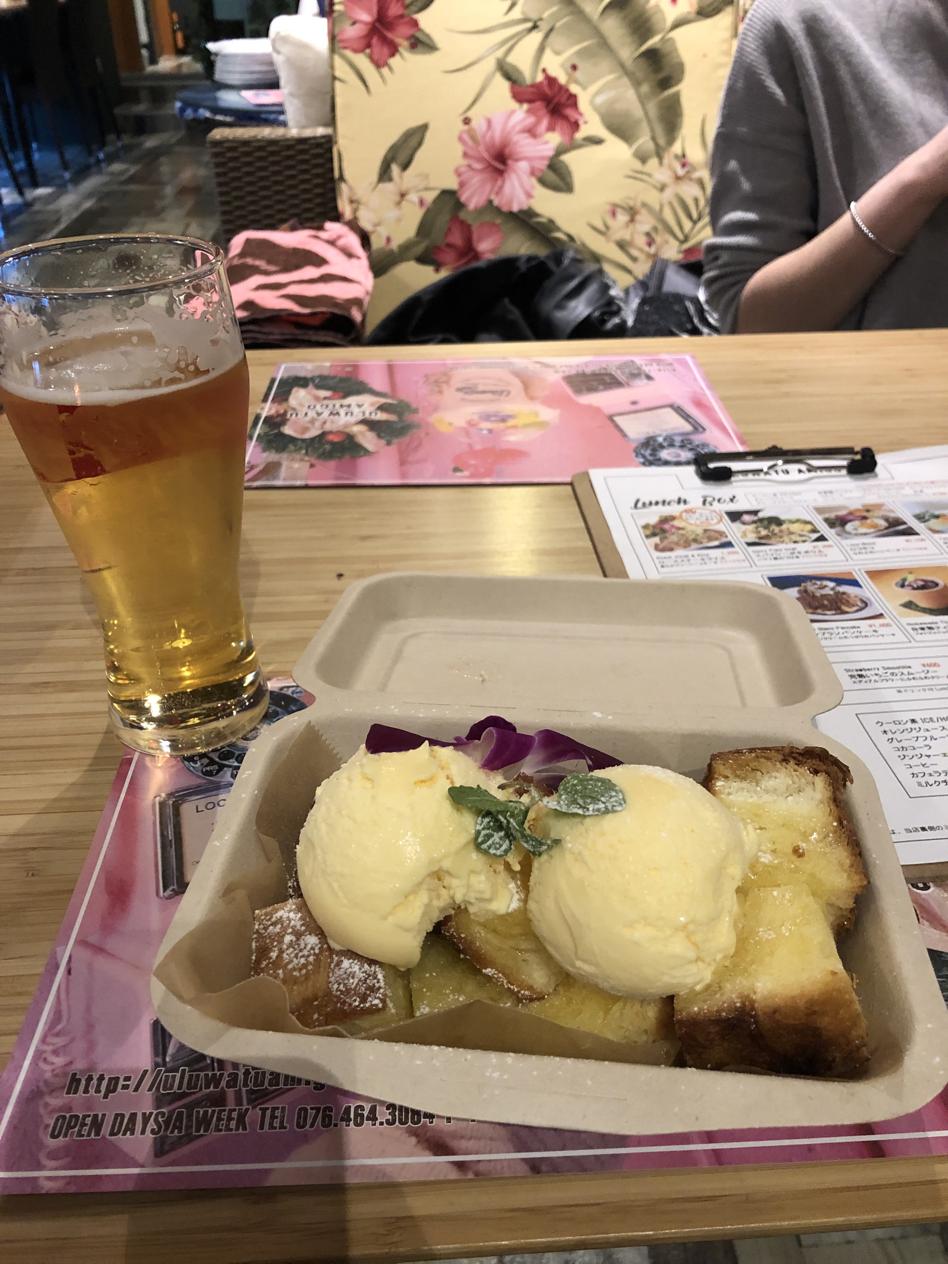 Nous repartons faire le tour de la galerie marchande et nous nous posons dans un café trop kawaii, brioche au miel et boules de glace vanille avec une bière. On est bien posé la 🙂