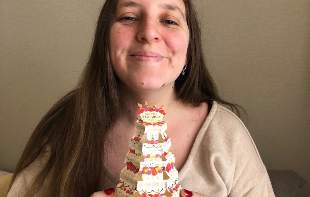Après le petit-déjeuner, Papa et moi offrons à Mim’ un gâteau d’anniversaire en papier.