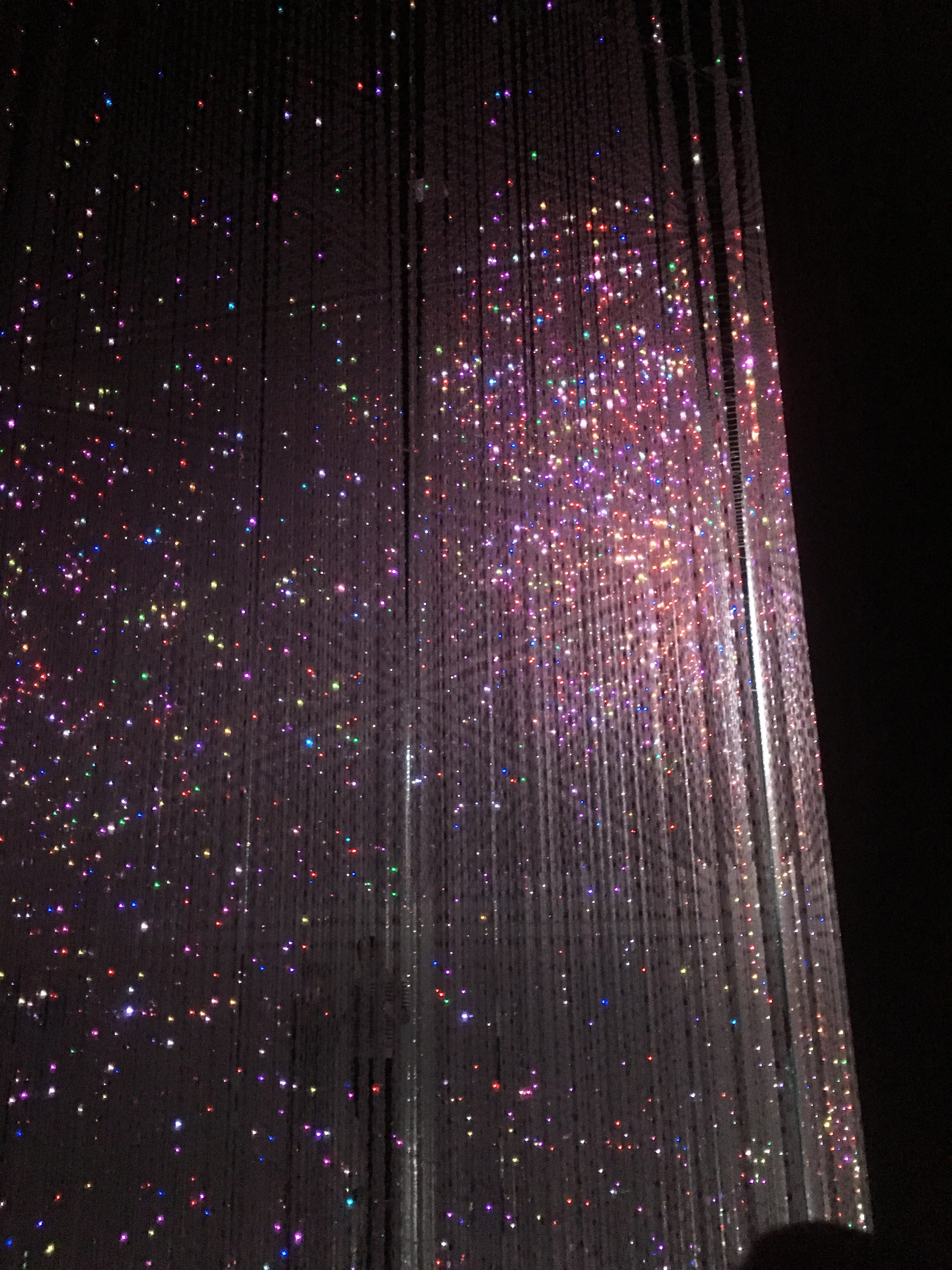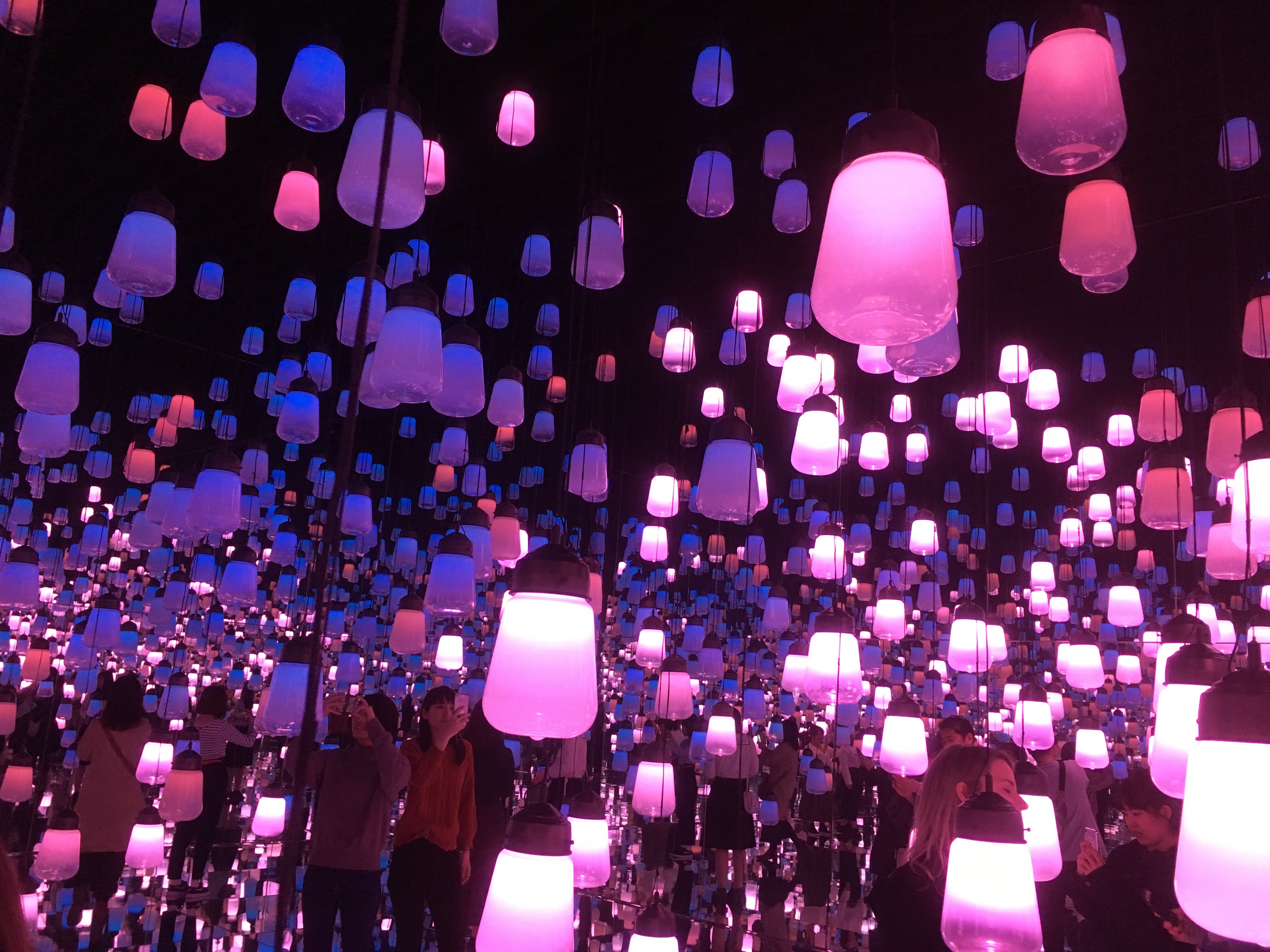 Maintenant, TeamLab! L’expo que nous avions visitée à La Villette était waouh! Mais là, c’est WAOUH! C’est magnifique, grandiose. [pas évident de faire des photos dans le noir, avec des images, toujours en mouvement, projetées sur les murs]