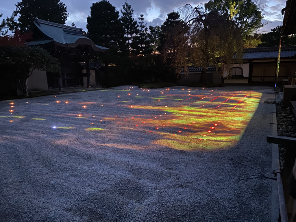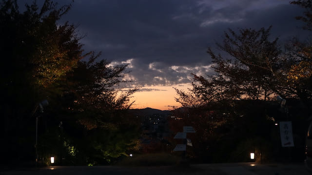 L’idée de base était de se faire le coucher de soleil au Kiyomizu Dera, mais le ciel est légèrement couvert. Sur la route, nous avions repéré un temple où il y a un spectacle lumineux, c’est donc là que nous allons.