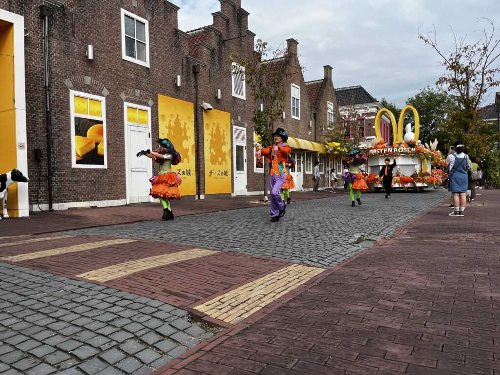La population locale est japonaise, point de hollandais de 2m… mais la décoration, l’architecture, et même le pavage des routes et trottoirs, on se croirait à Amsterdam ou Utrecht. L’ambiance sonore aussi. Estimation faite, il n’y a que 3 morceaux d’accordéon qui tournent en boucle.