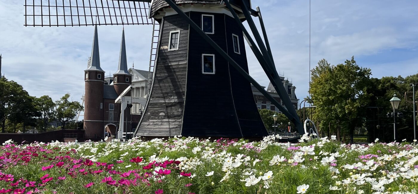 La population locale est japonaise, point de hollandais de 2m… mais la décoration, l’architecture, et même le pavage des routes et trottoirs, on se croirait à Amsterdam ou Utrecht. L’ambiance sonore aussi. Estimation faite, il n’y a que 3 morceaux d’accordéon qui tournent en boucle.