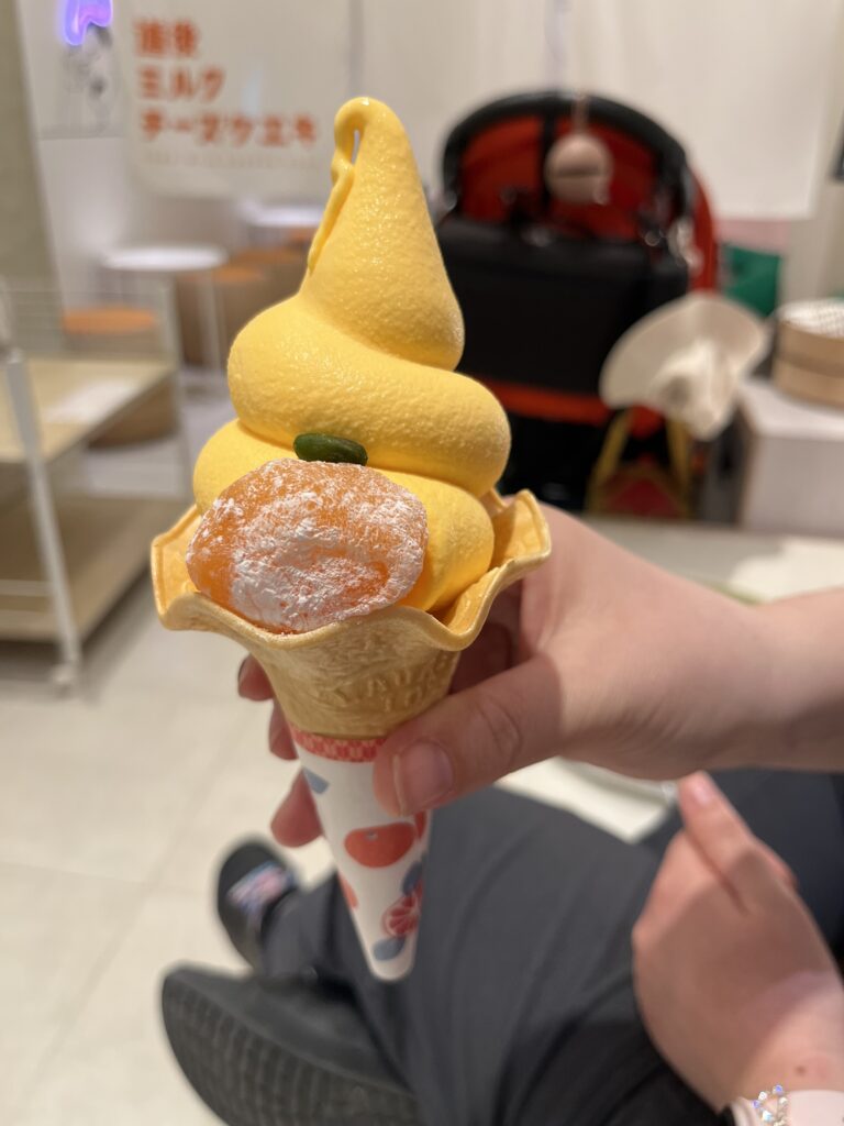 Nous nous baladons ensuite dans les galeries marchandes autour lorsque Cha se reveille, juste à temps pour le goûter . Ici, ils font de très bonnes glaces à l’orange!