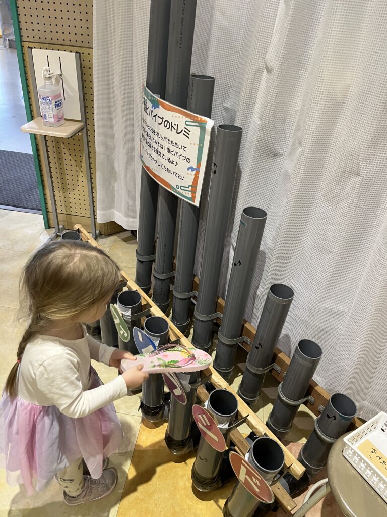 Ah non, c’est « puit de science »… mais il pleut, fort, beaucoup. Aussi nous allons à un parc de jeux pour enfants juste à côté de l’aéroport de Takamatsu, au sec, avec plein de jeux « scientifiques » à faire.